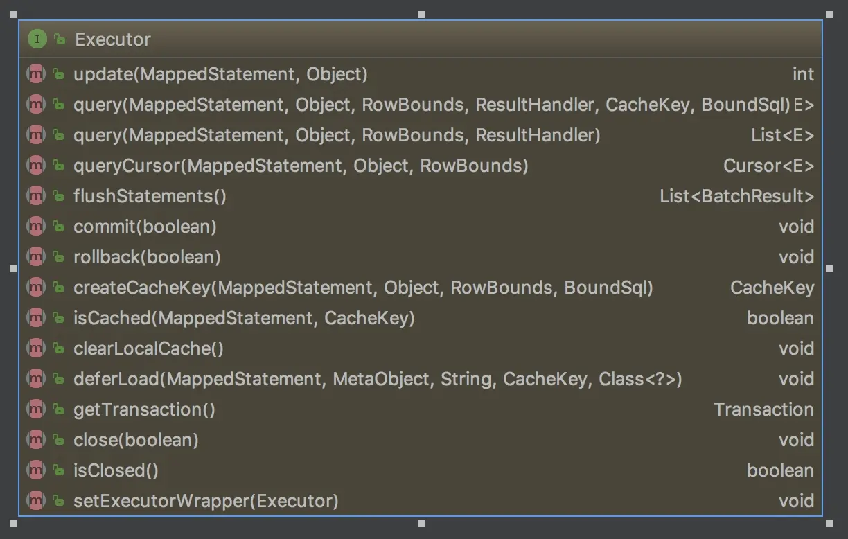 - Executor: 具体用来和数据库交互的执行器,接受MappedStatement作为参数。
