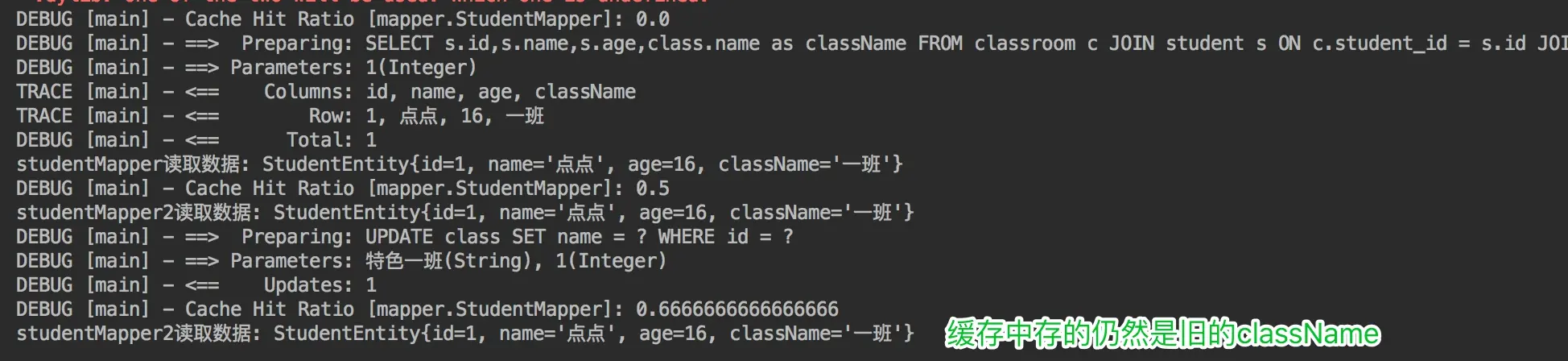 System.out.println("studentMapper2读取数据: " + studentMapper2.getStudentByIdWithClassInfo(1));
