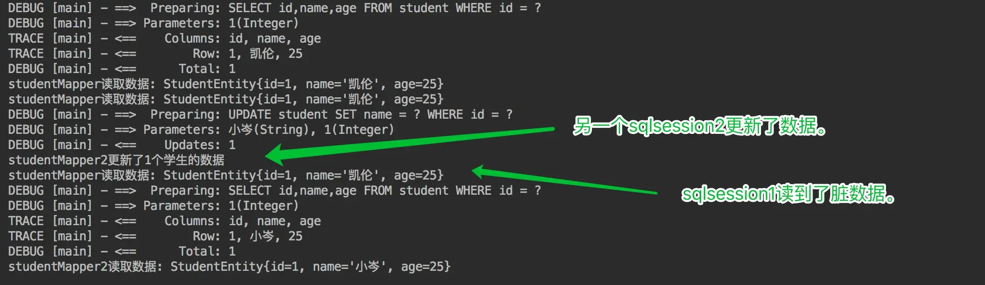 }我们可以看到,sqlSession2更新了id为1的学生的姓名,从凯伦改为了小岑,但session1之后的查询中,id为1的学生的名字还是凯伦,出现了脏数据,也证明了我们之前就得到的结论,一级缓存只存在于只在数据库会话内部共享。