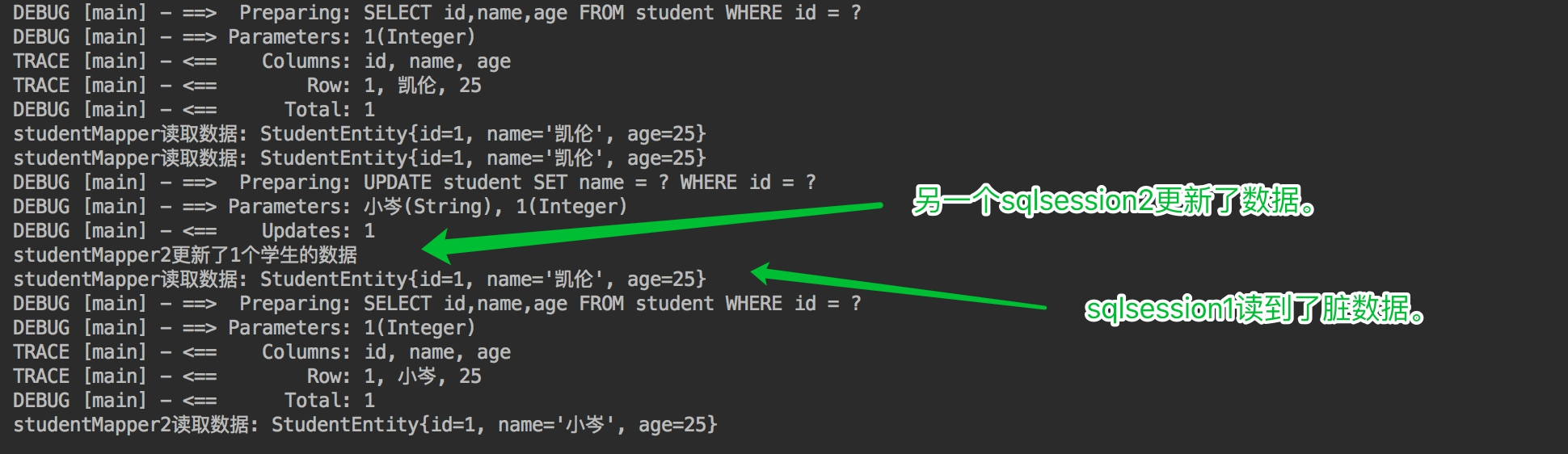 我们可以看到,sqlSession2更新了id为1的学生的姓名,从凯伦改为了小岑,但session1之后的查询中,id为1的学生的名字还是凯伦,出现了脏数据,也证明了我们之前就得到的结论,一级缓存只存在于只在数据库会话内部共享。