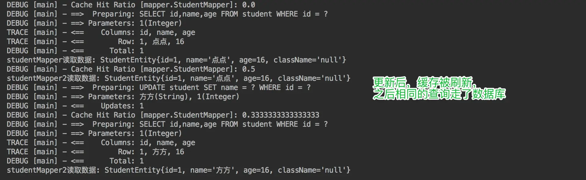 System.out.println("studentMapper2更新了" + studentMapper2.updateStudentName("小岑",1) + "个学生的数据");