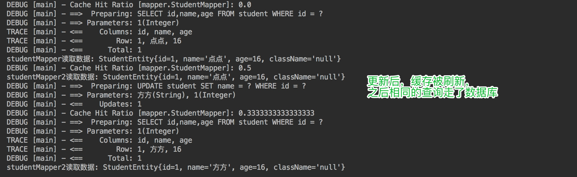 我们可以看到,在sqlSession3更新数据库,并提交事务后,sqlsession2的StudentMapper namespace下的查询走了数据库,没有走Cache。