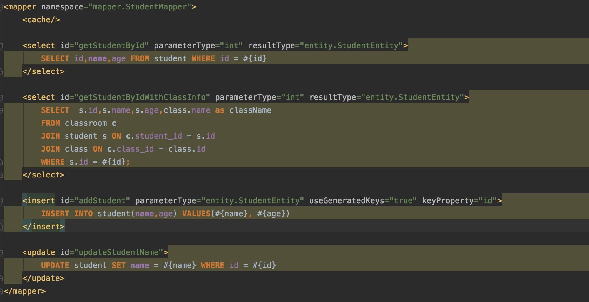 在Mybatis初始化的时候,每一个语句都会使用对应的MappedStatement代表,使用namespace+语句本身的id来代表这个语句。如下代码所示,使用mapper.StudentMapper.getStudentById代表其对应的Sql。