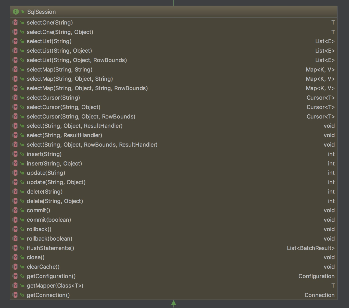 SqlSession: 对外提供了用户和数据库之间交互需要的所有方法,隐藏了底层的细节。它的一个默认实现类是DefaultSqlSession。