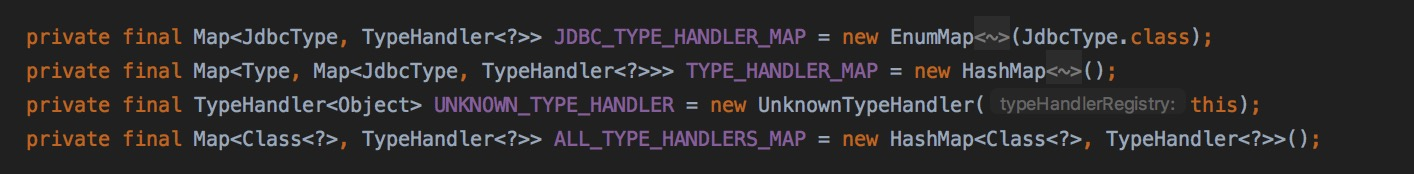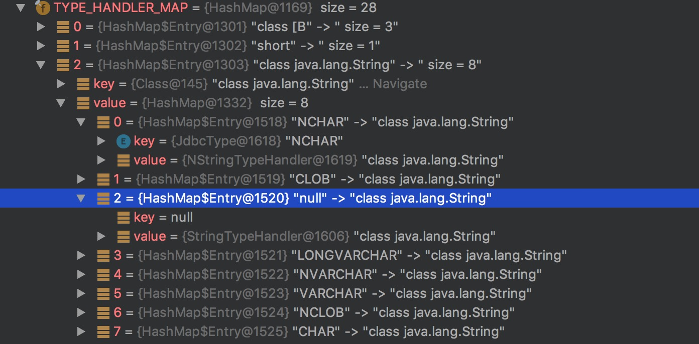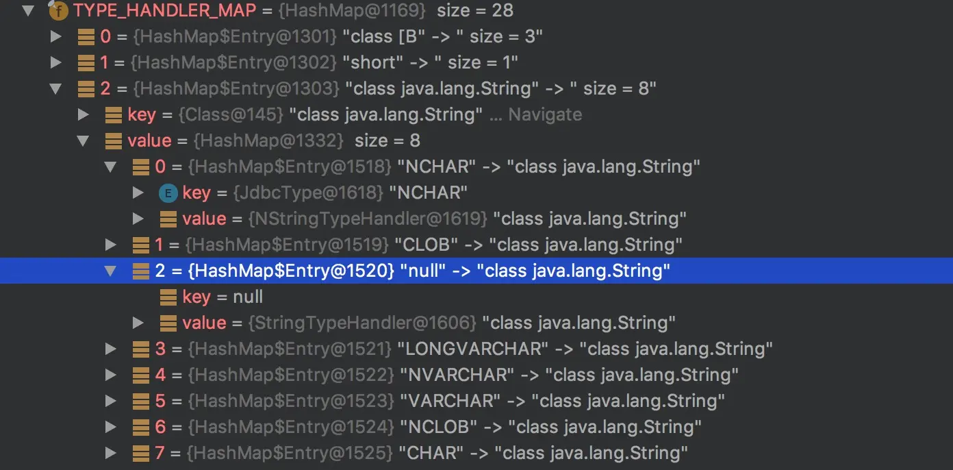 TYPE_HANDLER_MAP中记录的是Java类型和对应的所有JdbcType以及其对应TypeHandler的映射关系关系。