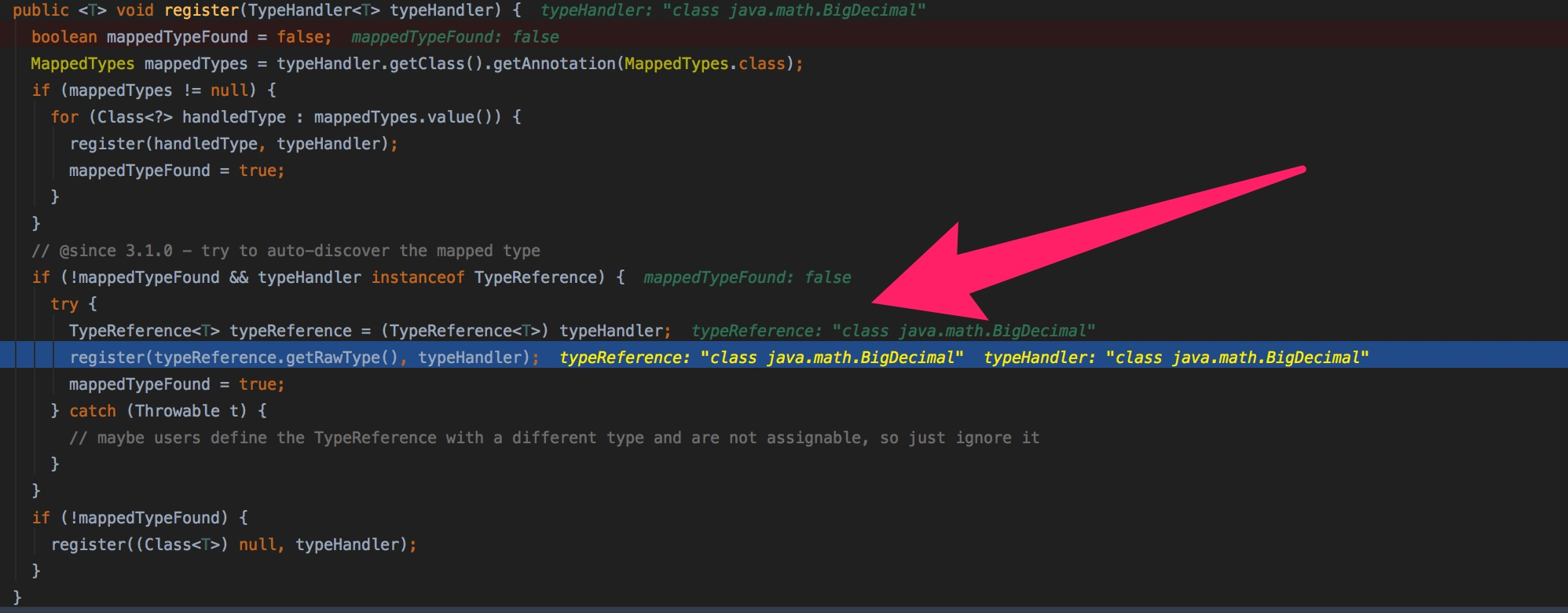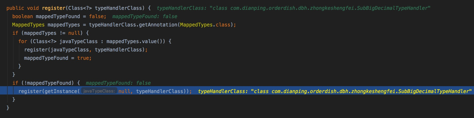 OK,前面是系统默认注册进去的,那我们看一下我们在如何使用章节中添加进去的SubBigDecimalTypeHandler是如何被注册进去的呢。