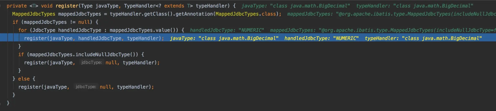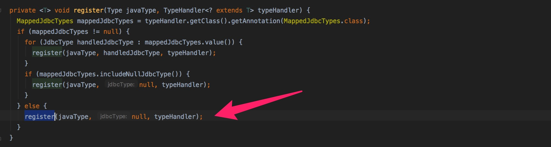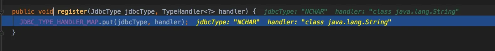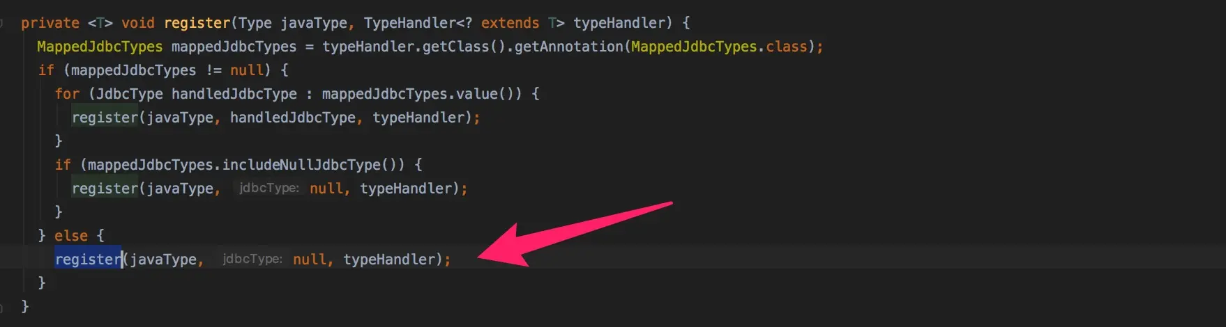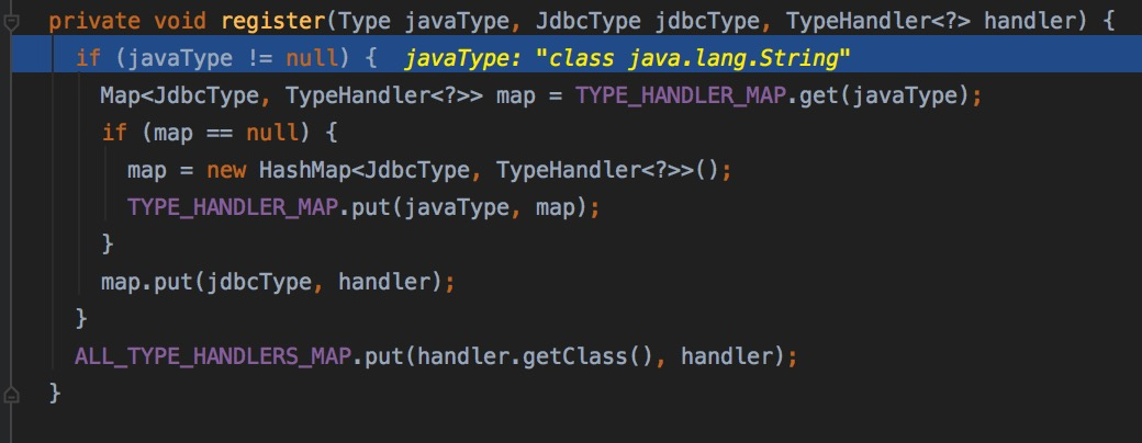 因为我们不是对整个package进行注册,所以进入else分支,因为只表明了一个最简单的Handler,所以要获取的字段都为null,由此我们也可以看出,在编写XML时,我们也是可以直接指定映射关系的,因为获取不到javaType和jdbcType,后面应该是会根据这个类再解析一波。跟注册相关的又回到了TypeHandlerRegistry这个类里面,职责还是很清晰的。
