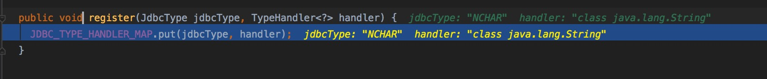 后续的代码比较简单,会先从Type_HANLER_MAP中看是否有已经存在的 Map> map,没有的话,新建,并且放入TYPE_HANDLER_MAP中,在Map> map放入此次的jdbcType和它对应的Handler。最后在ALL_TYPE_HANDLERS_MAP放入handler的类和实例。