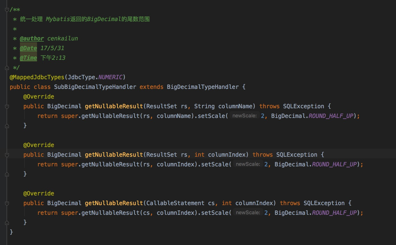 setScale(2, BigDecimal.ROUND_HALF_UP)因为这是一个全局性的要求,所有相关的地方,都需要有这个代码,虽然可以写一个工具类,各个地方调用,但就对原本间接的代码造成了侵入。既然这样,为什么不试试TypeHandler。