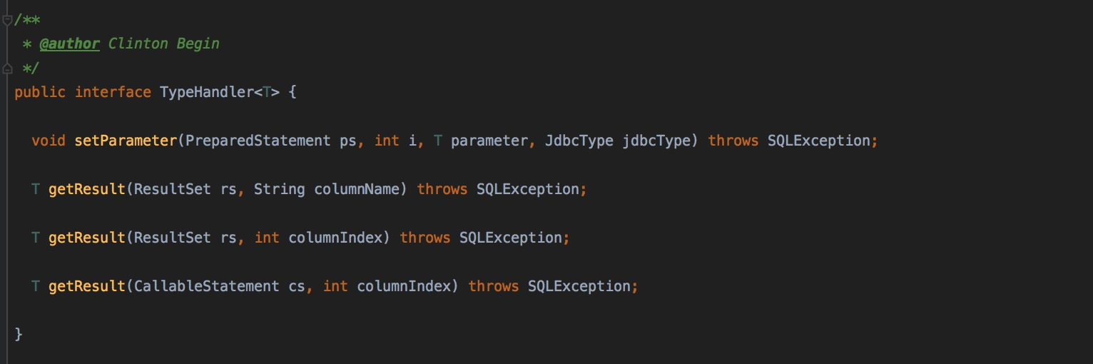 这个抽象类实现了TypeHandler接口,这个接口主要定义了类型转换的几种操作。