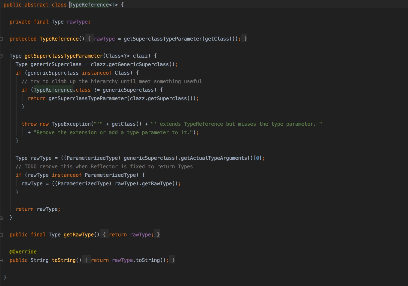 至于这个抽象类继承的TypeReference,主要是提供了获取这个T具体是哪个类型。在判断使用使用哪个TypeHandler时有用,后文会看到。