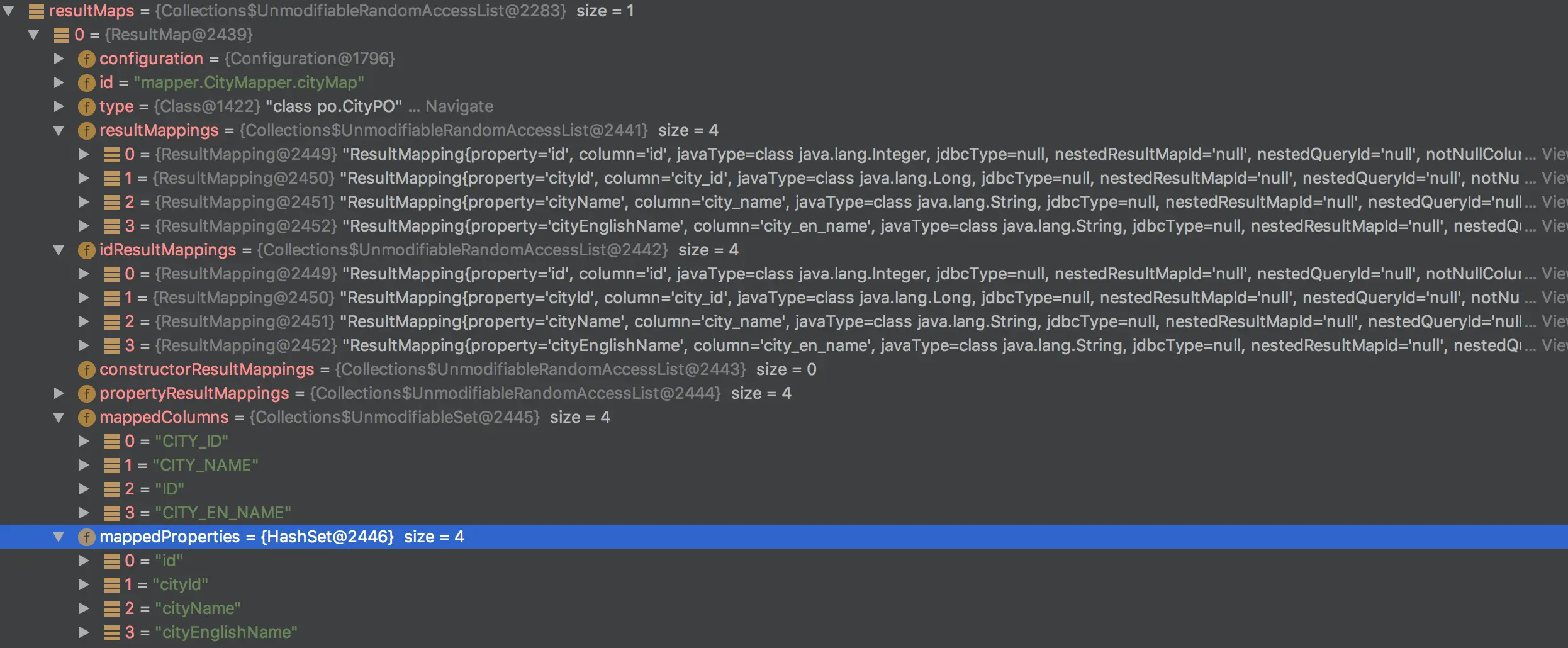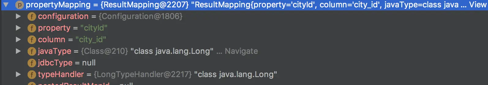 List<ResultMap> resultMaps = mappedStatement.getResultMaps();在这次的ResultMap中,相比之前方案,其属性更加的丰富起来。将之前写的Result的信息保存在了resultMappings,idResultMappings等中,以备后续使用。