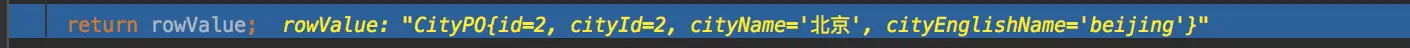 CityPO{id=2, cityId=2, cityName='北京', cityEnglishName='beijing'}那么我们来看看它是如何生效的,主要的代码在哪里。在昨天我们第一个介绍的函数handleRowValues中传入了参数rsw,它是对ResultSet的一个包装,在这个包装里,完成了具体使用哪个名字作为数据库的列名。