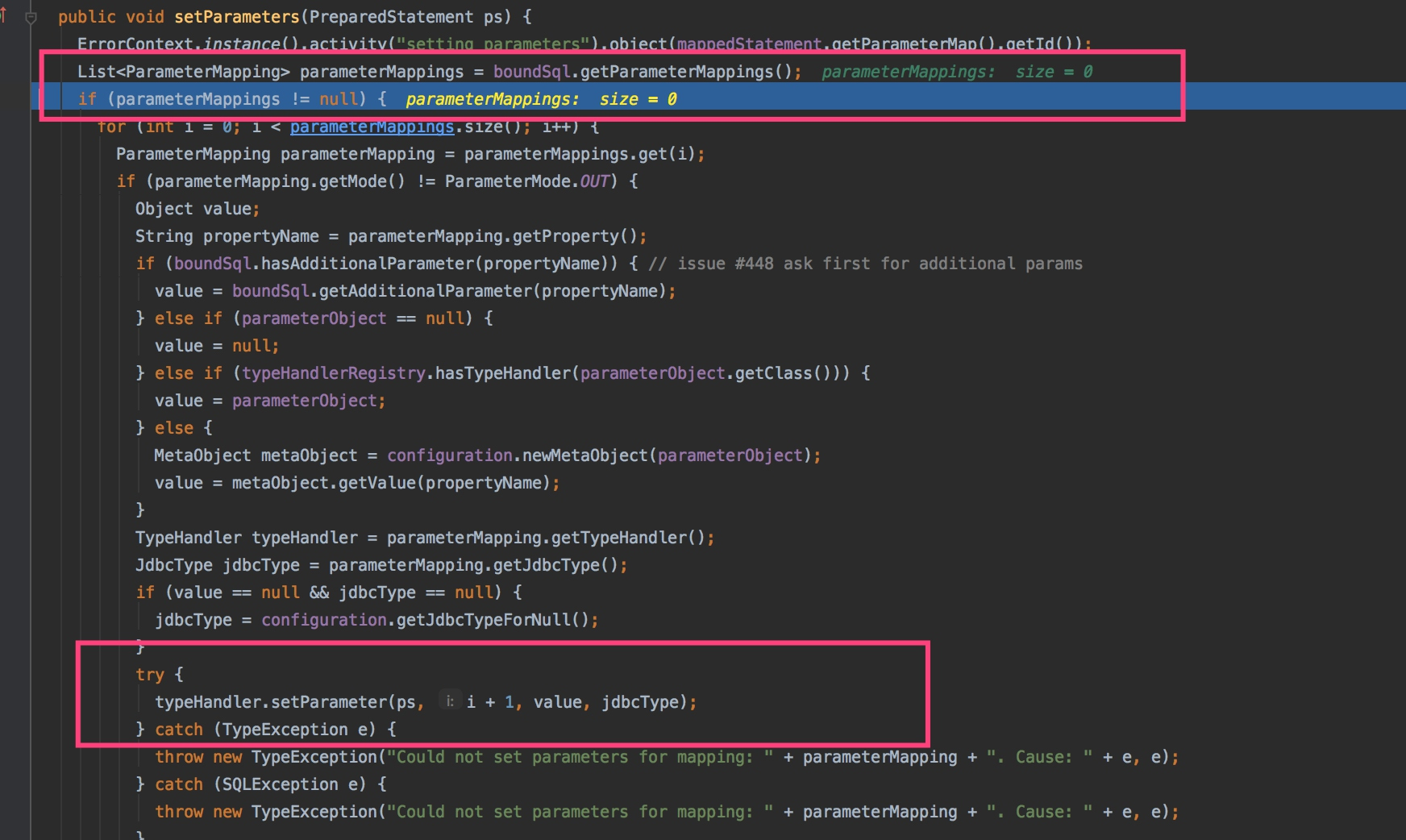 进入DefualtParameterHandler内部,如下图可知,我们看到,这儿boundSql的ParameterMappings不存在,所以不用执行第二个红框处,设置对应占位符的操作。
