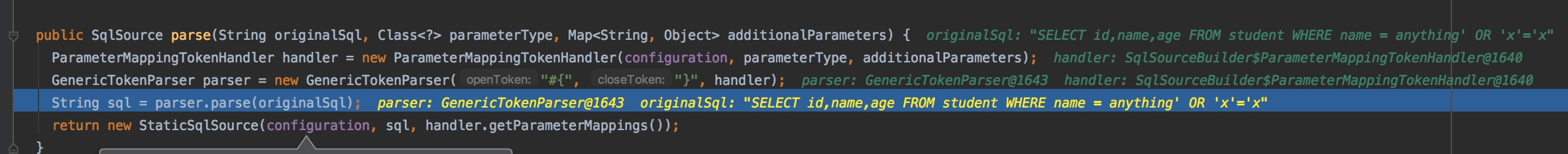 从下图中可以看到,这个TokenParser这回使用的是#{},而且使用的是ParameterMappingTokenHandler。