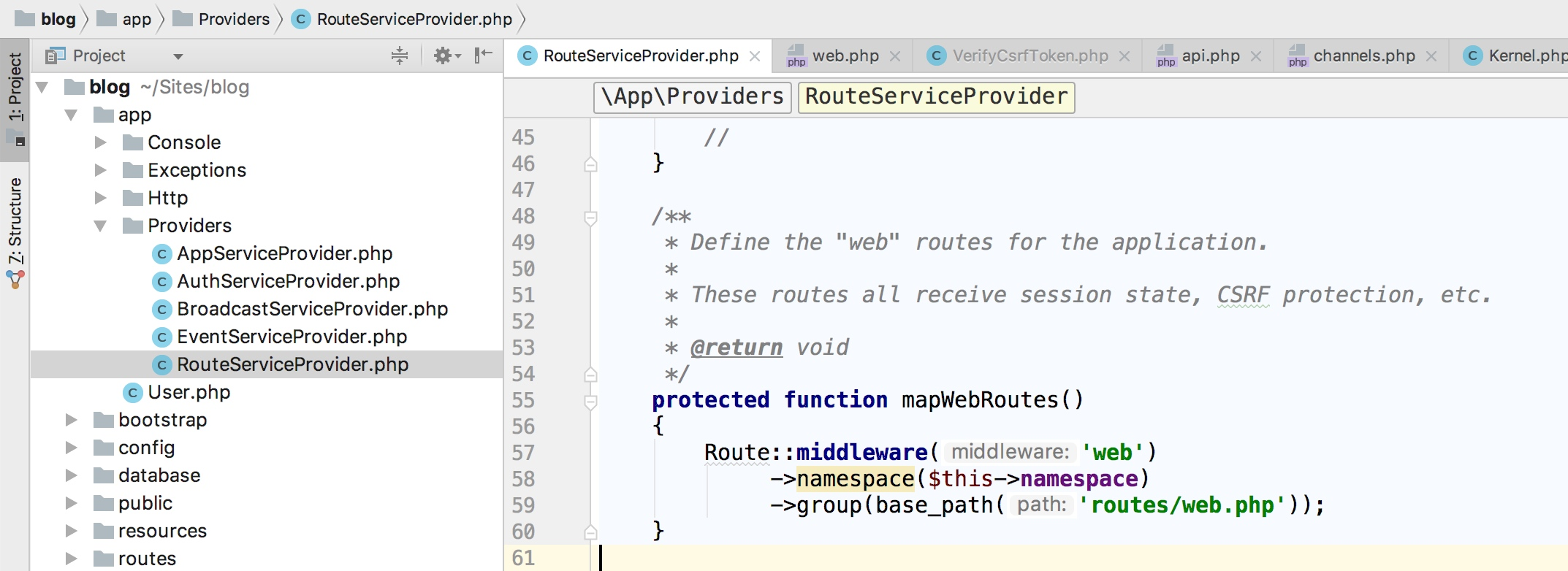 你应该注意到我们在定义控制器路由的时候没有指定完整的控制器命名空间,而只是定义了 App\Http\Controllers 之后的部分,那为什么可以这么做呢?这是因为默认情况下,RouteServiceProvider 将会在一个指定了控制器所在命名空间的路由分组中载入路由文件,故而我们只需指定后面相对命名空间即可:
