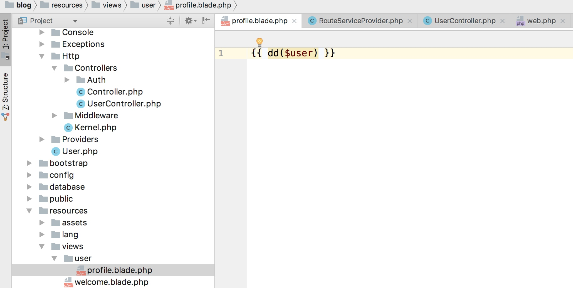 这样我们在浏览器中访问 http://blog.dev/user/1,就会看到打印结果了: