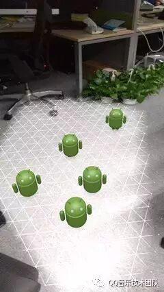 编译项目并在设备上运行,打开相机权限,移动拍摄位置,会出现很多星点,经过计算之后会识别出平面位置,点击平面会放置绿色的安卓logo,效果图如下。