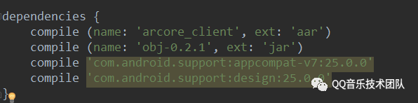 根据对so包文件名称猜测,这个apk才是ARCore的核心,供应用中的jni接口调用。在 Android Studio 中,找到 /samples/java_arcore_hello_ar,并打开 HelloAR 示例项目,主要依赖文件有arcore_client.aar和obj-0.2.1.jar