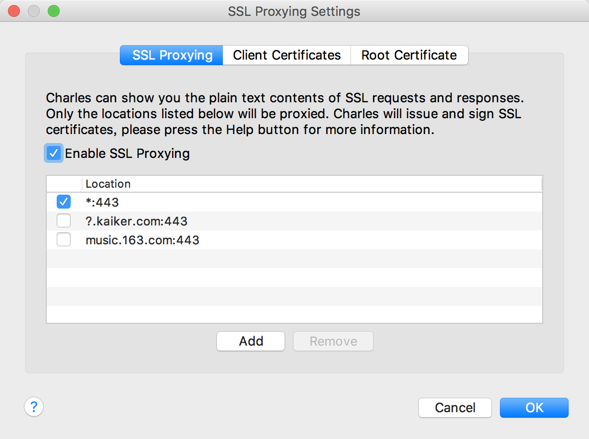 - 选择 SSL Proxying 选项卡,勾选 Enable SSL Proxying,点击 Add 填入网址(网址支持通配符写法,一般我们直接写 * 就行了)和端口号(一般ssl的端口号都是 443)然后 OK