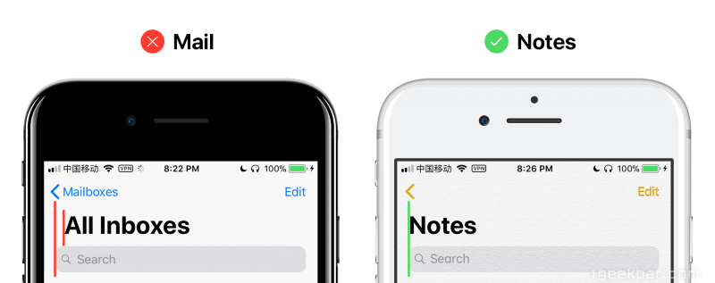 首先我们看一下iOS 11上面的Mail.app。就像其他的原生apps一样,Mail也引进了带着大标题的导航条。然而,相较于设计指南样本,Mail上面的大标题有多余的左边距。在这里,我们将搜索条作为参考对象。在设计指南样例中,大标题和搜索条相对于屏幕边缘的距离是相同的,但是在Mail.app中,与搜索条相比,大标题很明显往右偏移了一些。