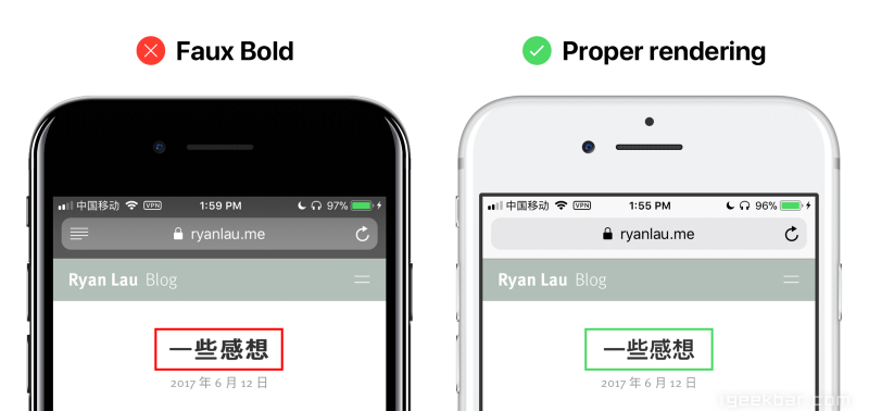 这是iOS 11 Safari中的PingFang(iOS的默认中文字体)的粗体字体。当我在iOS 11上调试个人网站时,我发现了这个问题。所有的比较都是在iOS 11和iOS 10之间进行的。