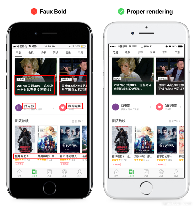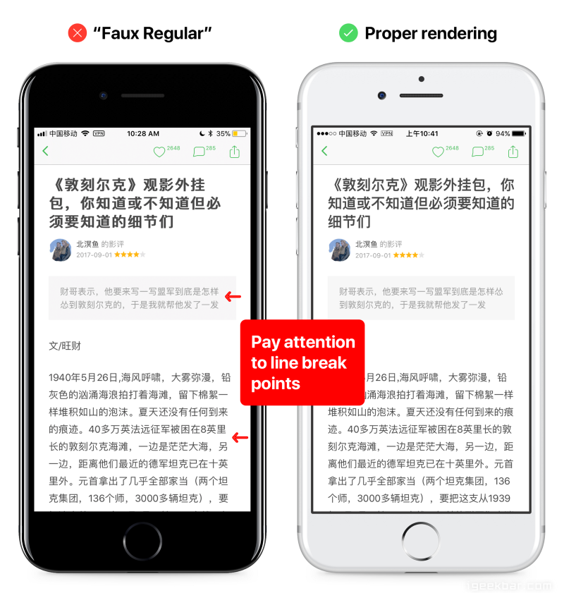 随机选择一个电影评论文章,你会注意到标题是粗体。通过比较,你还会注意到,粗体字体中的字体间距是有问题的。其实这不只是伪粗体的问题,还波及常规或任何字体的重量,所以你看到“伪Regular”等等。伪 Regular 或许很难从笔画粗细这一角度发觉问题,但通过下图对比,可以发现 iOS 11 中正文的字距也偏大,足以证明这是「伪 Regular」: