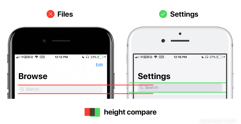 这是我发现的第二个问题。。。。如果我召唤出搜索区域,这就看起来不太对了。我们可以跟Contacts app 列表比较一下。有很多东西都都错了。搜索条的背景颜色和大小都不太对