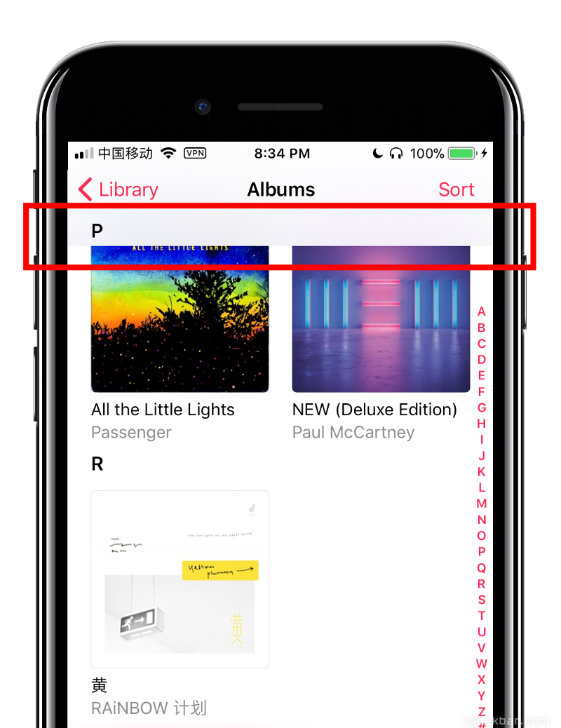 又是Apple Music,通过Library进入专辑列表之后,点击首字母列表来快速进入以那个字母开头的专辑,你会看到那个首字母所在的小节遮住了专辑封面的一部分。