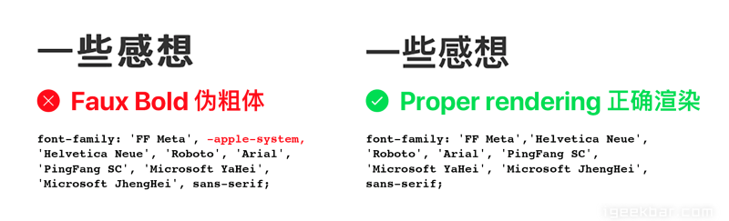 如上图所示,PingFang实际上是渲染为粗体。伪粗体基本上不使用字体本身提供的字体重量,而是强制地在某些基本字体上增加字体重量。伪粗体是由算法生成的,通常缺乏质量,引起笔画重量和字母跟踪的问题。在屏幕截图中,你可以看到,iOS 11中的伪粗体PingFang在文本之间有更大的间距。