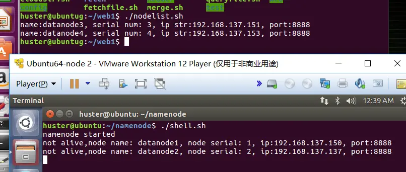 如上图所示,是data node server, name node server都启动后的截图,上面三个是数据结点, 最下面的是name node。