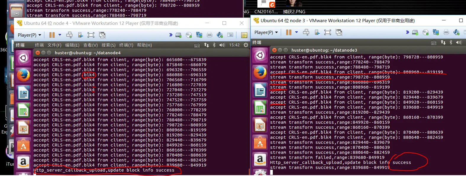 那么对于特定的data node,比如D1接收完CRLS.pdf.blk1,怎么才算接收完毕呢?对于data node 1,线程池里同时有N个线程在处理接收CRLS.pdf.blk1的不同的分片。笔者是这样的处理的:在发送数据的头部,记录该分片是所在block的第几个分片,以及所在的block是原始文件的第几个block. 当D1检测到所接收的数据分片是对应的block的最后一片分片的时候,D1就会等待其他该block的其他分片被处理完毕,然后发消息给NS请求更新文件的元信息。为了支持该操作,我们定义了一个二维数组node_block_meta_info[m][n], 其中m是原始文件被分成的block的数目,n是特定block对应的分片的信息。如果某个线程接收到第一个block的第一个分片,那么它就负责分配node_block_meta的第一维空间,如果线程接收到了第x个block的第一个分片,那么负责创造对应的第二维存储空间,也即node_block_meta_info[x]=....malloc()....