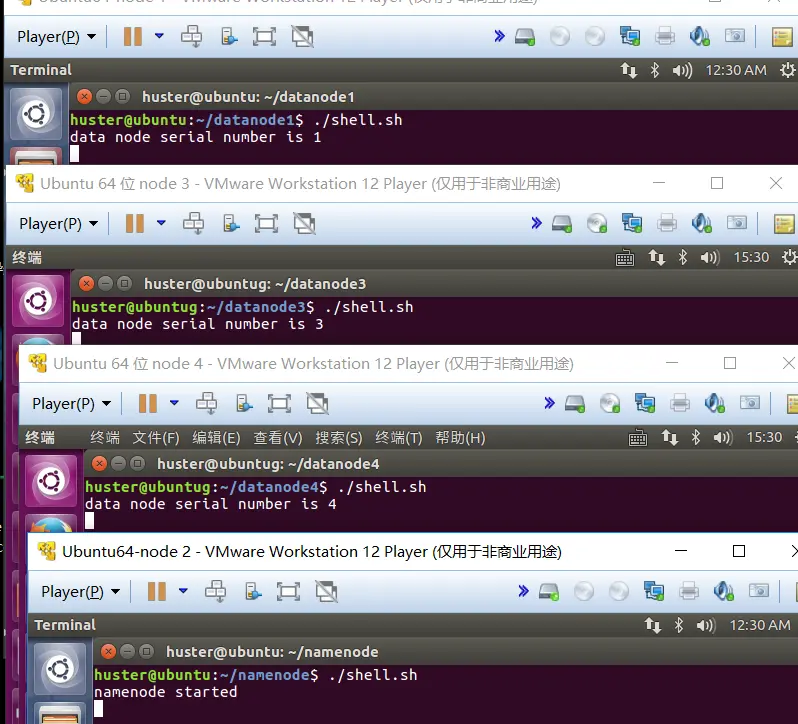 前文提到了分布式结点,包括data node, name node等,目前笔者并没有条件搭建一个真正的分布式环境。但是好在有免费版的vmware player, 所以笔者用vmware 创建了4个虚拟机,每一个虚拟机模拟一个结点,四个虚拟结点的名字分别是data node 1, data node 2, data node3, data node4, 为了方便后续代码的处理,四个虚拟结点分别分配了一个串号:1,2,3,4 。串号唯一标志了一个虚拟结点。为什么不用ip地址来标记呢?因为结点的ip 地址并不是一直保持不变的。根据笔者这段时间做实验的经验来看,每隔几天,虚拟机的ip地址都会变好一次,使用ifconfig命令就可以看到虚拟ubuntu的ip v4地址。