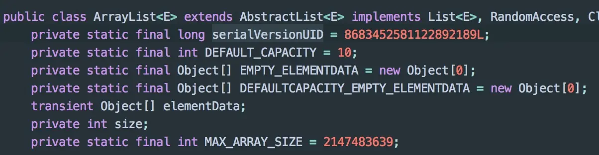- Object[] elementData:数据结构---数组