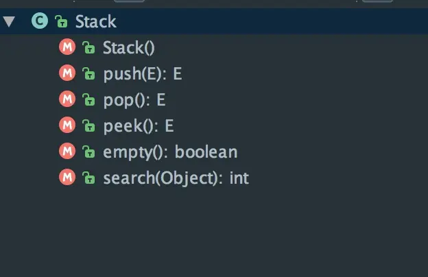 }整个类的实现非常简单,就是继承 Vector,然后添加了 peek、pop、push、search 等方法,然后然添加删除都在最末尾的元素做操作即可。