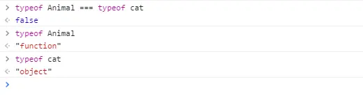 总结一下,javascript的new关键字主要的作用是继承,上面例子中,cat对象在产生时便继承了Animal中定义的方法和属性,因此cat不是Animal的实例而是其子类(不严谨的说法)。可能有人还会想:cat既然是new出来的,那cat和Animal应该是同类型的。我认为既然是父类和子类的关系,那就不可能是同类型,不信,你看: