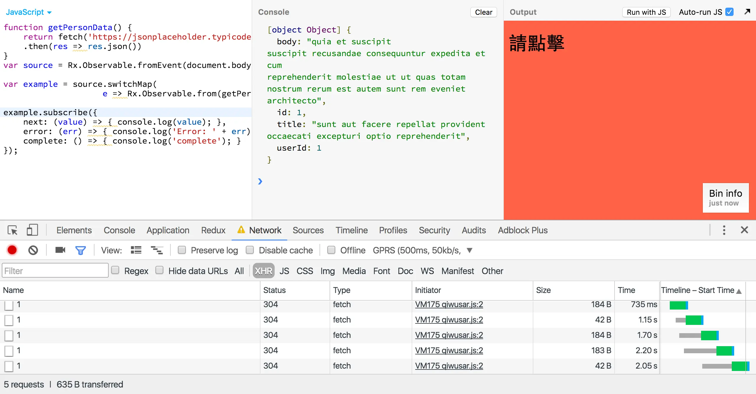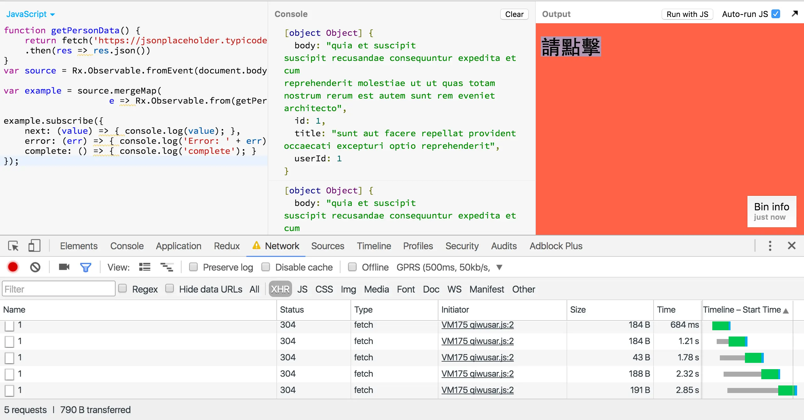 大家可以注意看上面这张图,我连续点按了五下,但第四个 request 是在第一个完成后才送出的,这个很适合用在特殊的需求下,可以限制同时发送的 request 数量。