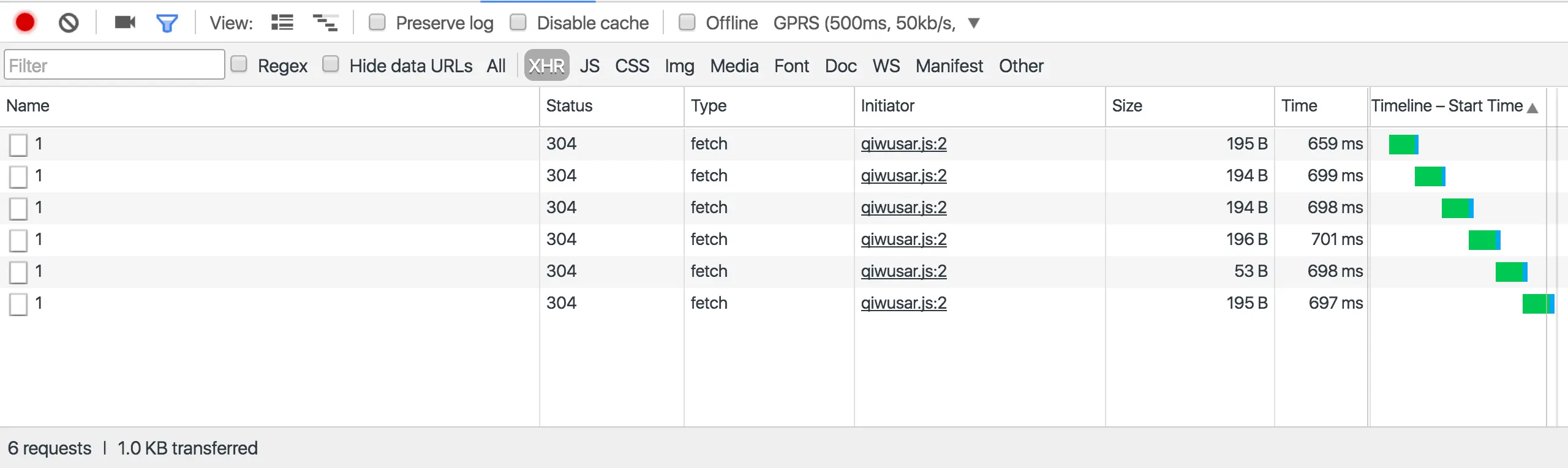 从 network 的图形可以看得出来,第二个 request 的发送时间是接在第一个 request 之后的,我们可以确保每一个 request 会等前一个 request 完成才做处理。