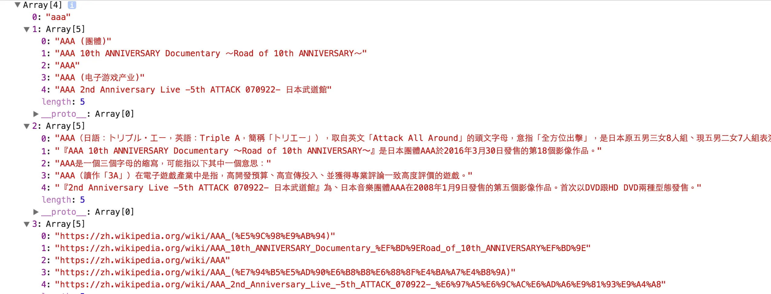 大家可以在 console 看到资料长相这样,他会回传一个数组带有四个元素,其中第一个元素是我们输入的值,第二个元素才是我们要的建议选项清单。
