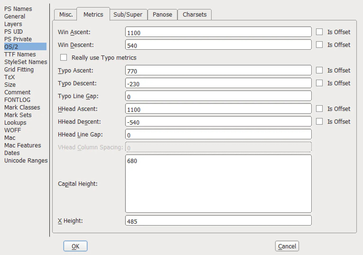 这里有必要做一个解释:Win Ascent使用在windows系统中的。HHead Ascent是用在Mac系统中的。基本上设计师在设计的时候两者的值都时一样的。之所以有两个,是因为有两个主流系统,并且他们又不按照同一个标准走,为了兼容才这样。