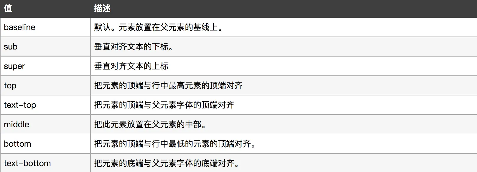 接下来就要去了解vertical-align中的各个参数的值了:(top,text-top,middle,baseline,text-bottom,bottom等)文字太抽象,直接看(参数图):