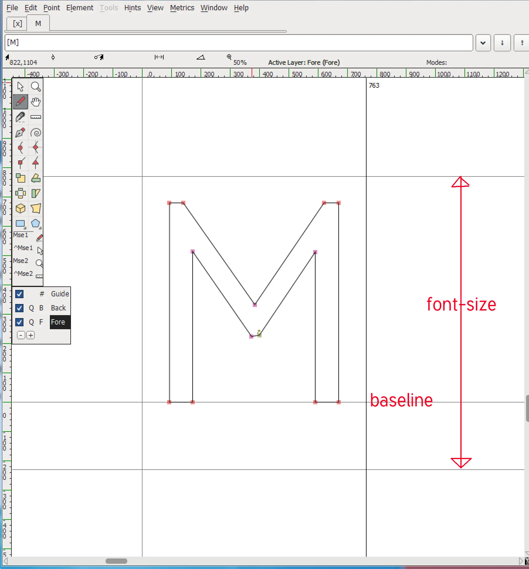 接下来就看一下字体是如何制造出来的,这你要去了解一个工具Fontforge,如何你有兴趣研究,可以参考参考资料(1)快速入门。我们在这款字体工具中打开M这个字体(O是一样的)。