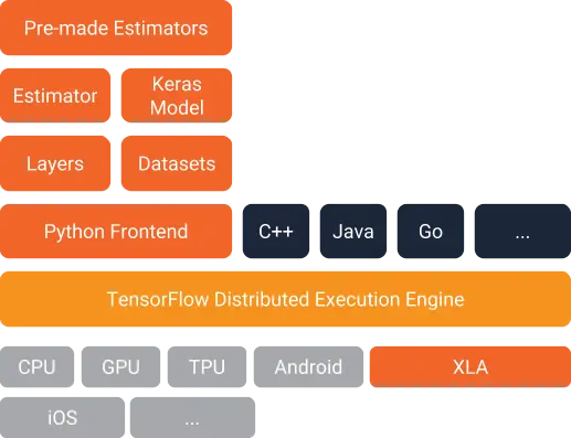 下面是它们在 TensorFlow 架构内的装配方式。结合使用这些估算器,可以轻松地创建 TensorFlow 模型和向模型提供数据: