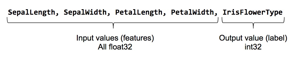 首先,我们来看一下要用来为模型提供数据的数据集。我们将从一个 CSV 文件读取数据,这个文件的每一行都包含五个值 - 四个输入值,加上标签: