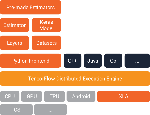 下面是它们在 TensorFlow 架构内的装配方式。结合使用这些估算器,可以轻松地创建 TensorFlow 模型和向模型提供数据: