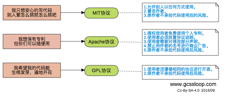 在这些常见的协议当中,BSD和MIT的协议相对比较宽松,Apache次之,会保留作者的专利版权,GPL限定性更强。知乎网友www.gcssloop.com/tips/choose…