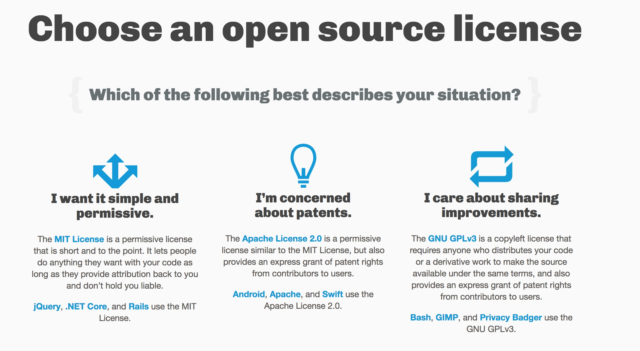 choosealicense.com/ 这个网站提供了选择开源协议上的一些建议。