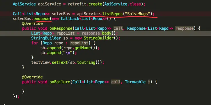 Call<List<Repo>> solveBus = apiService.listRepos("SolveBugs");