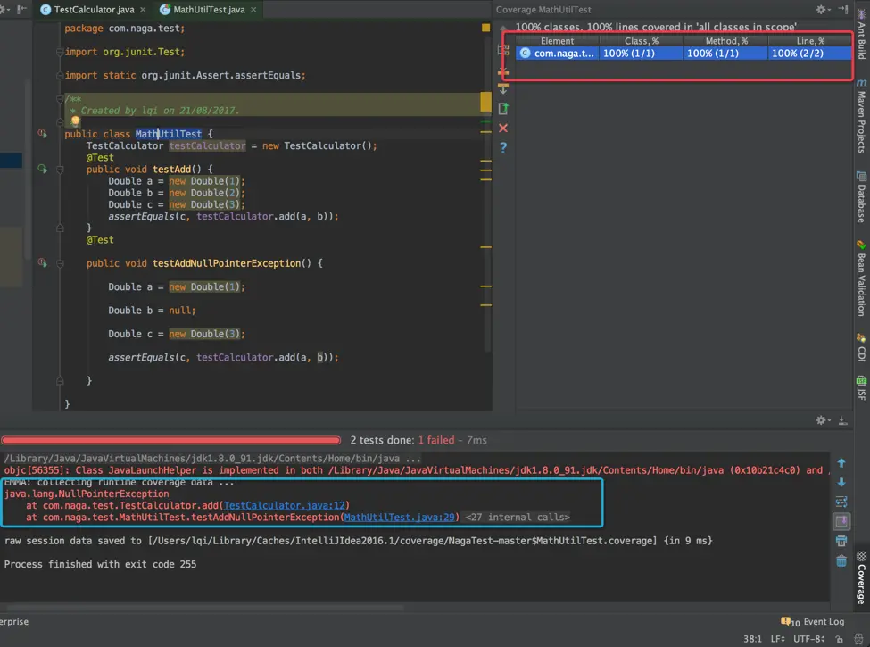 好了,你会发现尽管覆盖率为100%,但程序却抛出了NullPointerException。