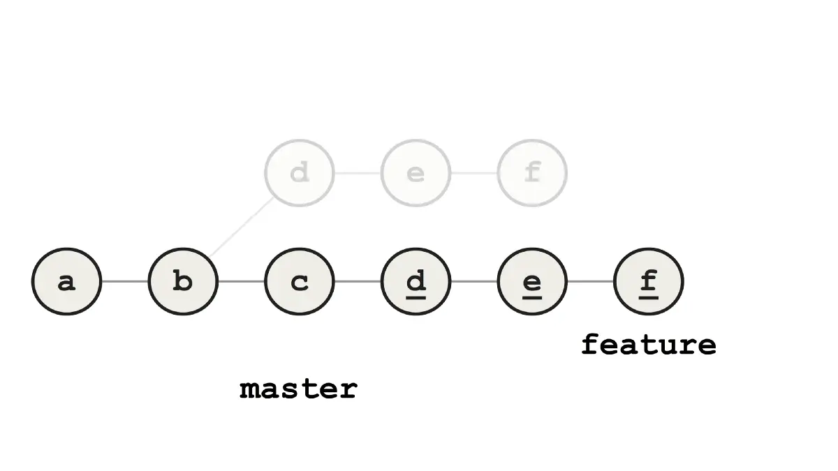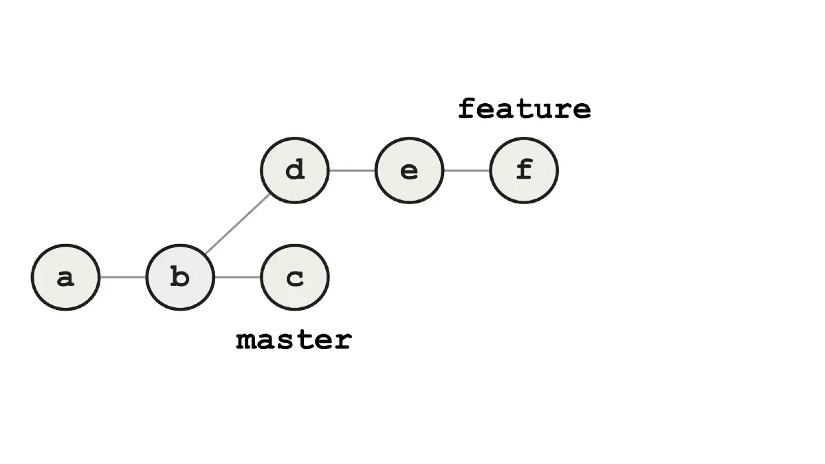 我们现在将 feature 的基础提交从b变为了c,这就是 rebase 的意思。将 feature 合并到 master 是一个快进合并,因为在 feature 上的所有提交都是 master 的直接子代。